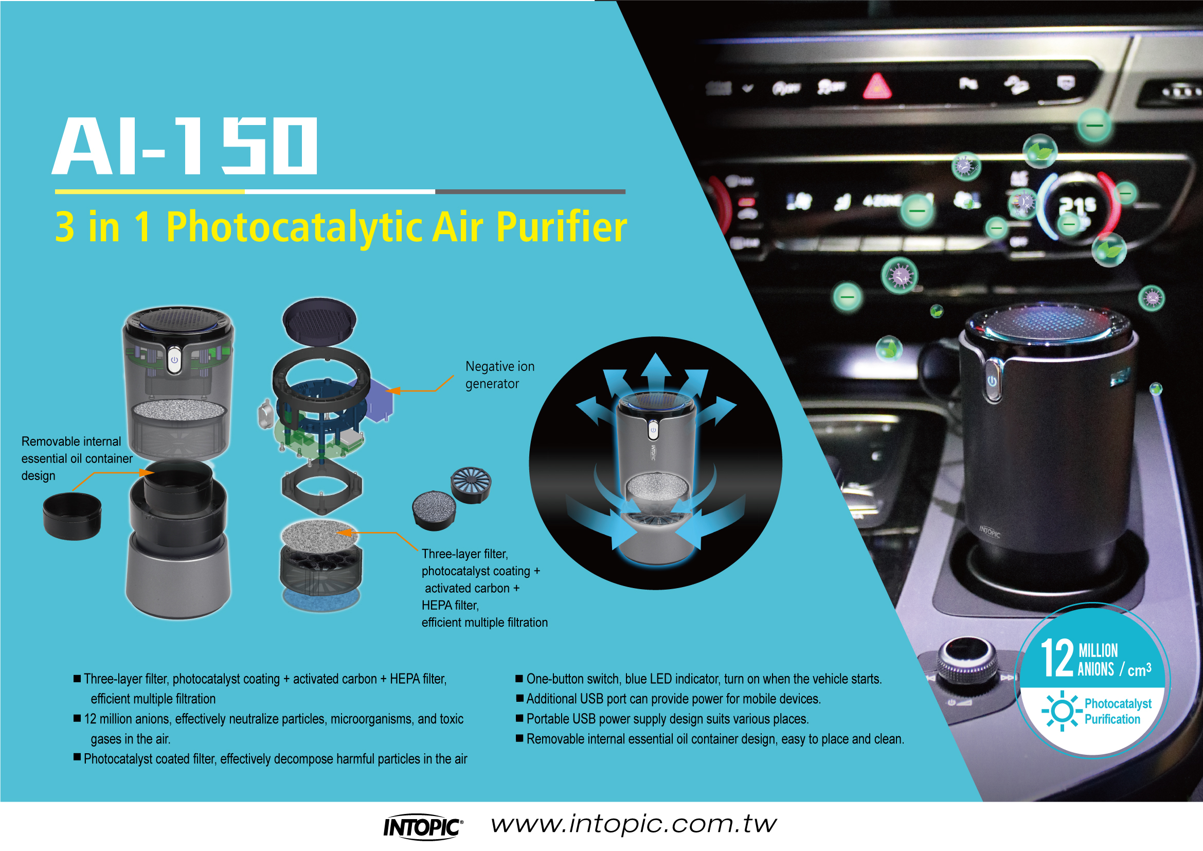 ▶12 million anions, effectively neutralize particles, microorganisms and toxic gases in the air.