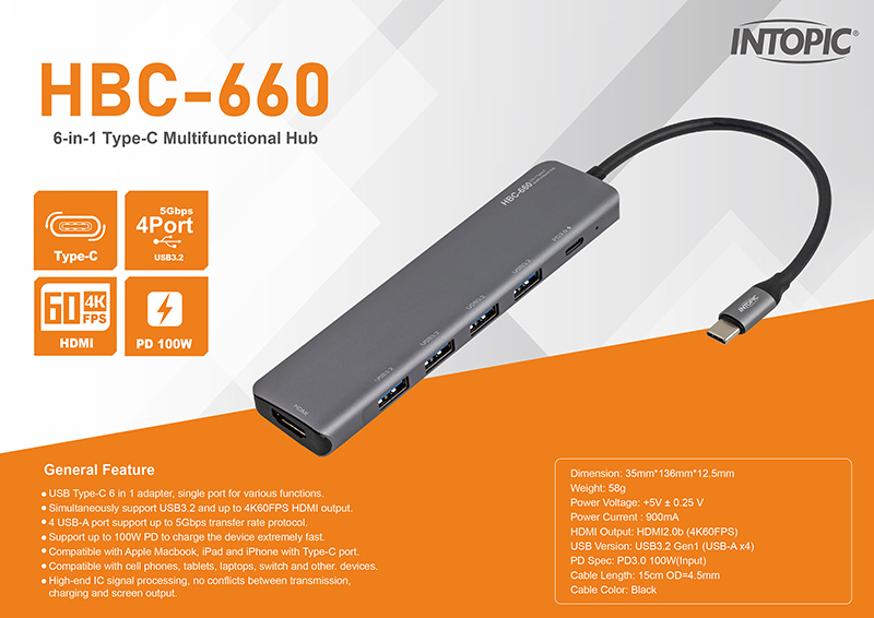 USB Type-C 6 in 1 adapter, single port for various functions.