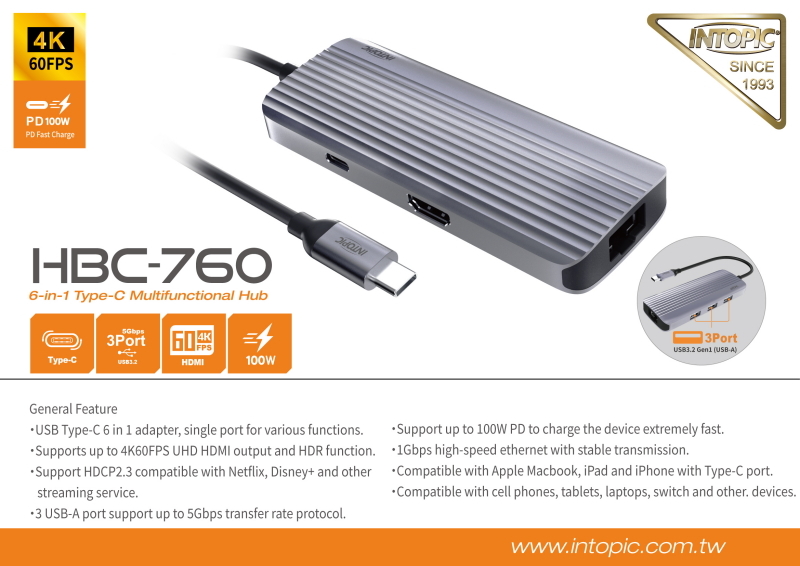 USB Type-C 6 in 1 adapter, single port for various functions.