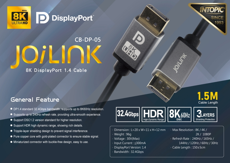▶DP1.4 standard 32.4Gbps bandwidth, supports up to 8K60Hz resolution.