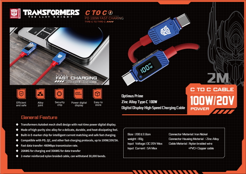 Built-in E-marker chip for intelligent current matching and safe fast charging.