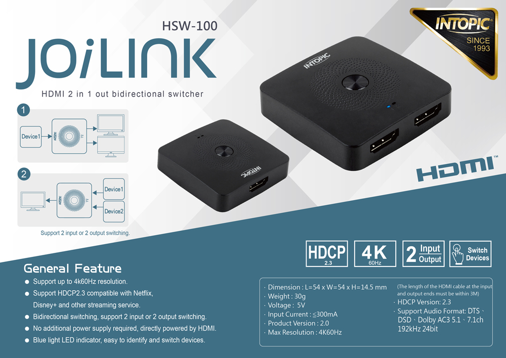 ▶Bidirectional switching, support 2 input or 2 output switching.