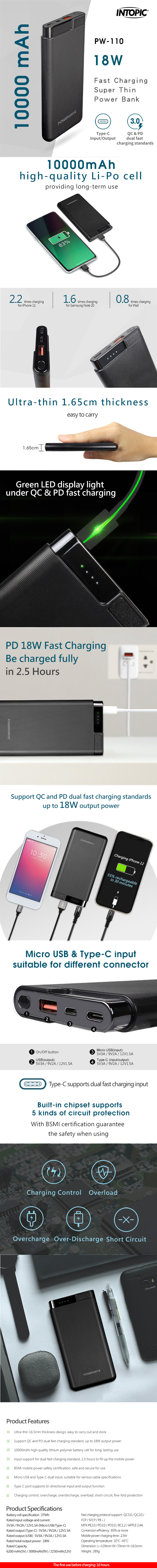 Support QC and PD dual fast charging standards, up to 18W output power.
