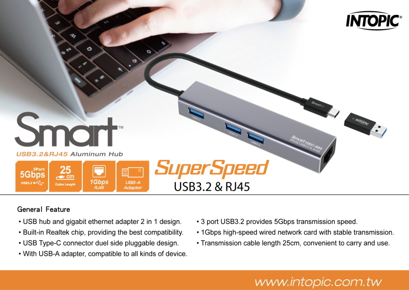 USB hub and gigabit ethernet adapter 2 in 1 design.
