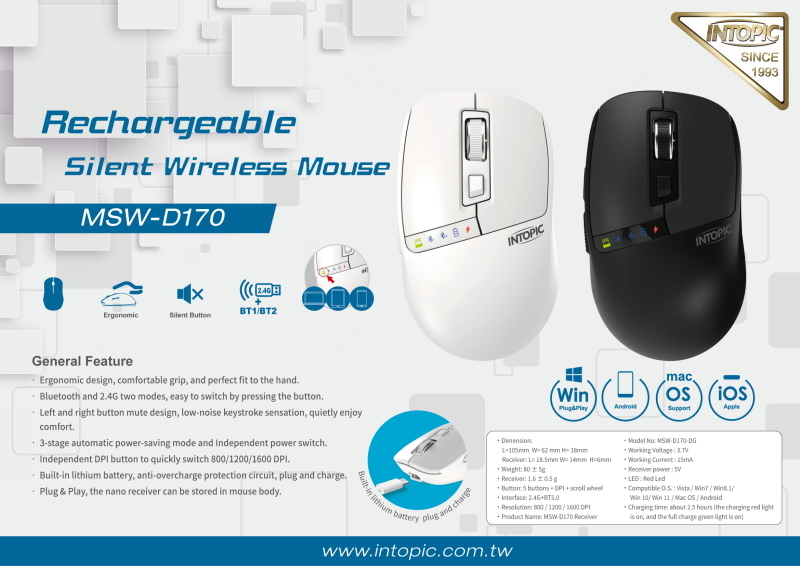 Quick DPI switch (800/1200/1600) via dedicated button.