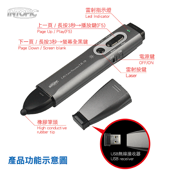 ▶簡報上/下翻頁功能, 播放鍵(F5) 與 螢幕全黑鍵