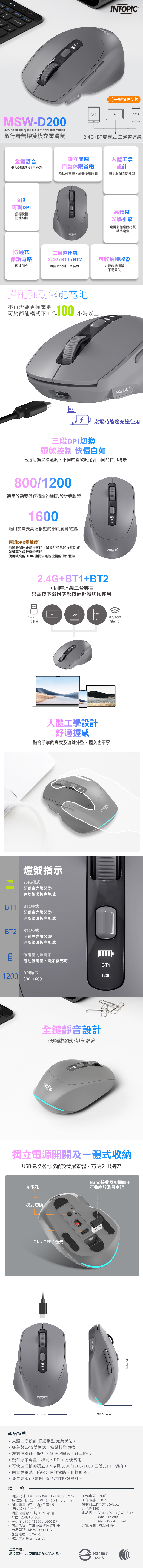 ▶可快速切換的獨立DPI按鍵,800/1200/1600 三段式DPI 切換。