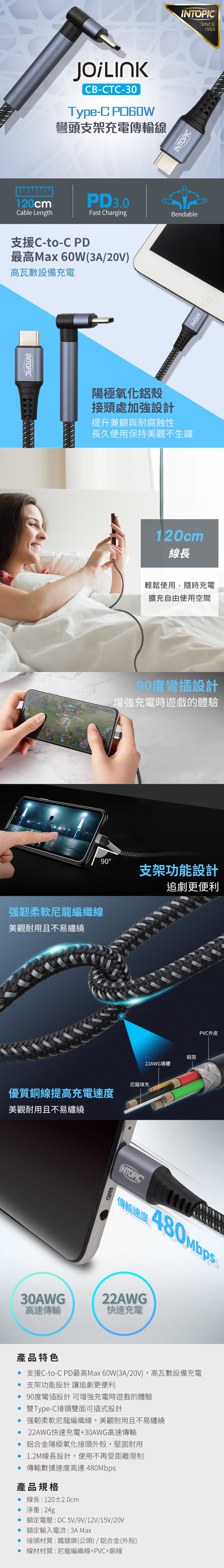 ▶援C-to-C PD最高Max 60W(3A/20V),高瓦數設備充電