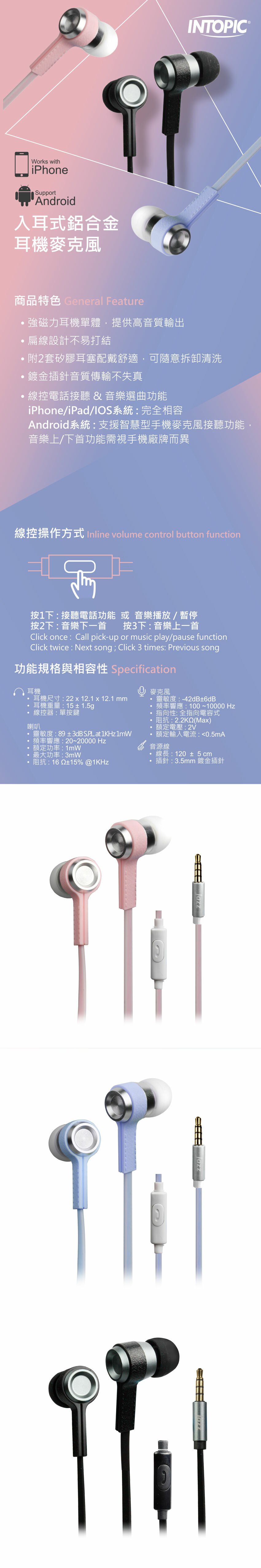 ▶耳式鋁合金耳機麥克風,強磁力耳機單體,提供高音質輸出
