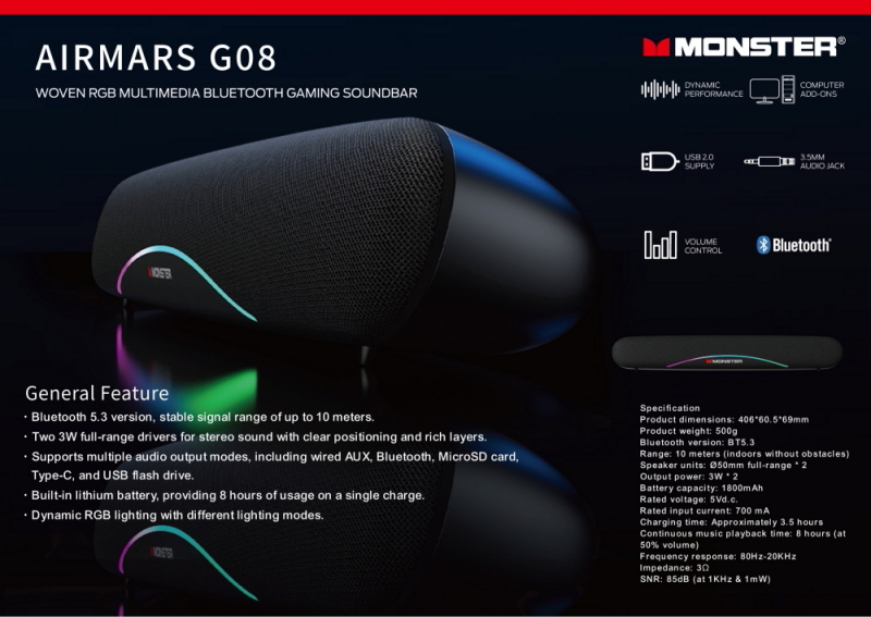 • Supports multiple audio output modes, including wired AUX, Bluetooth, TF card, Type-C, and USB flash drive.