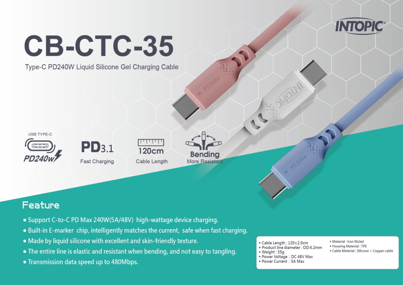Built-in E-marker chip, intelligently matches the current, safe when fast charging.